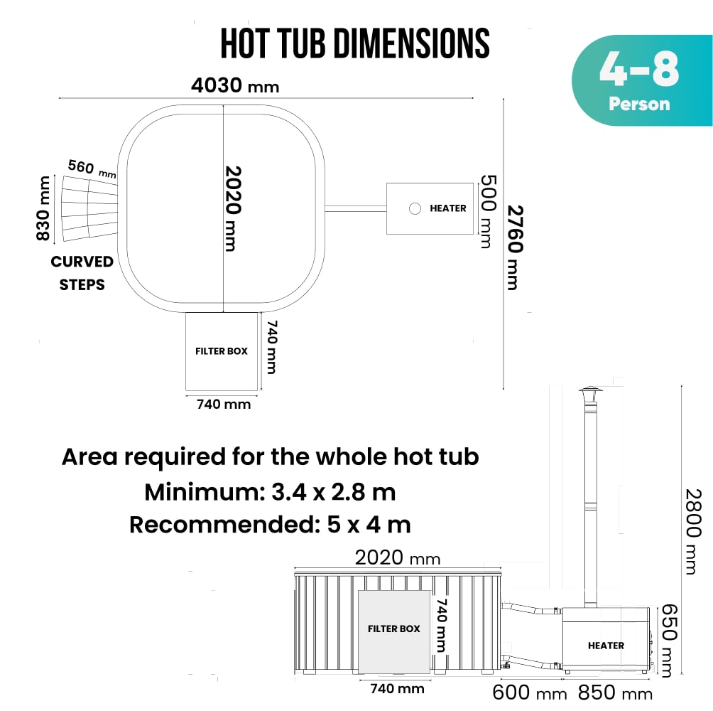 Square Wood Fired Hot Tub for 4-8 | Targeted Massage With 28 Hydro Jets | External Heater