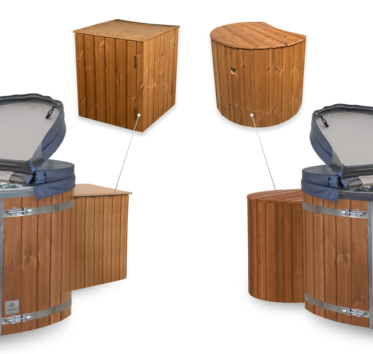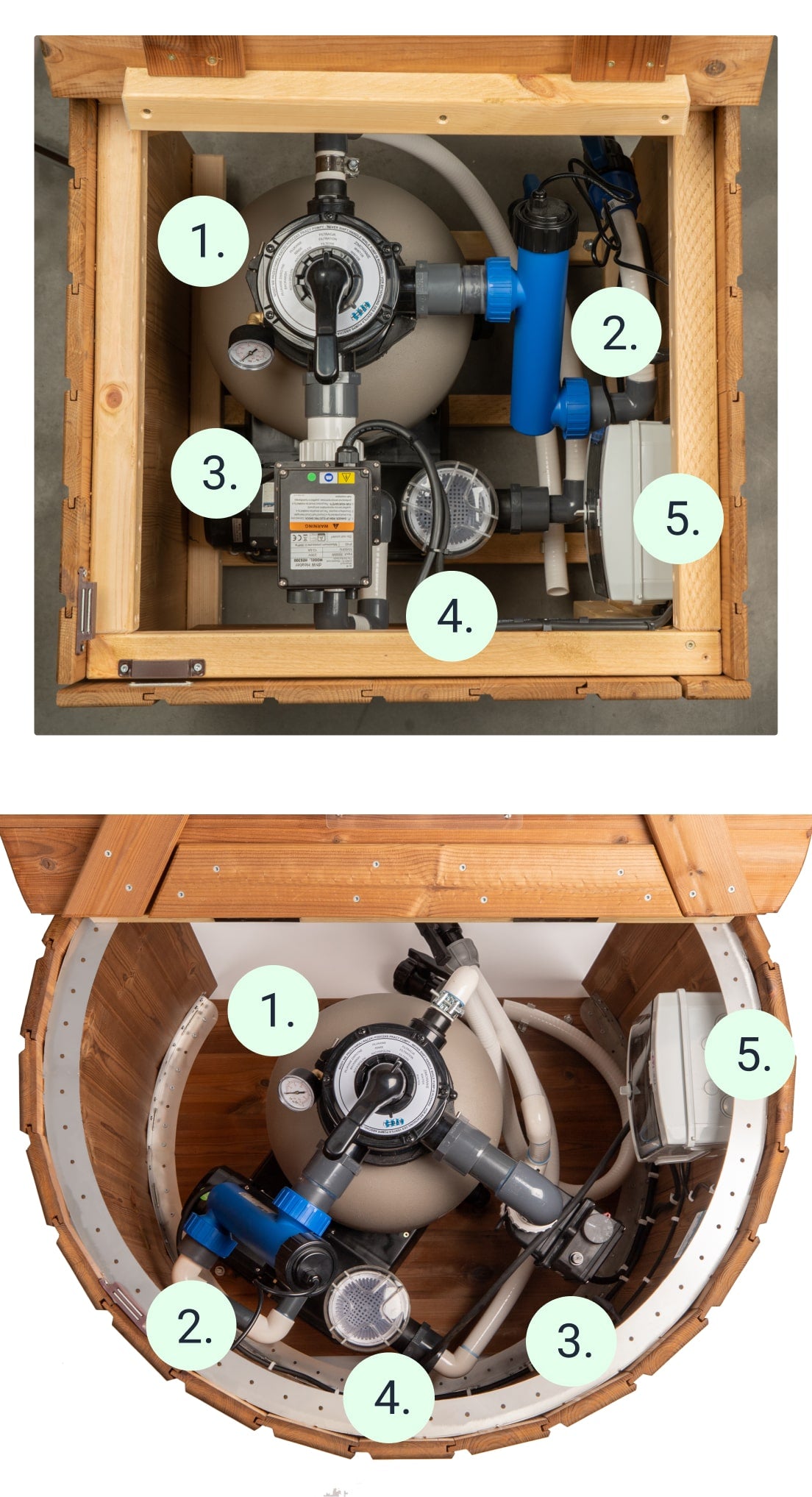 • Eckige Filterbox – ein zeitloser Klassiker, der perfekt zu eckigen Hot Tubs passt, sich aber auch wunderbar mit runden Modellen kombinieren lässt.