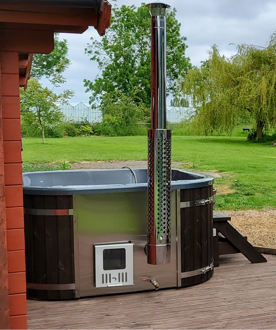 Gardenvity wood fired hot tub beside a red brick countryside house with rustic charm.