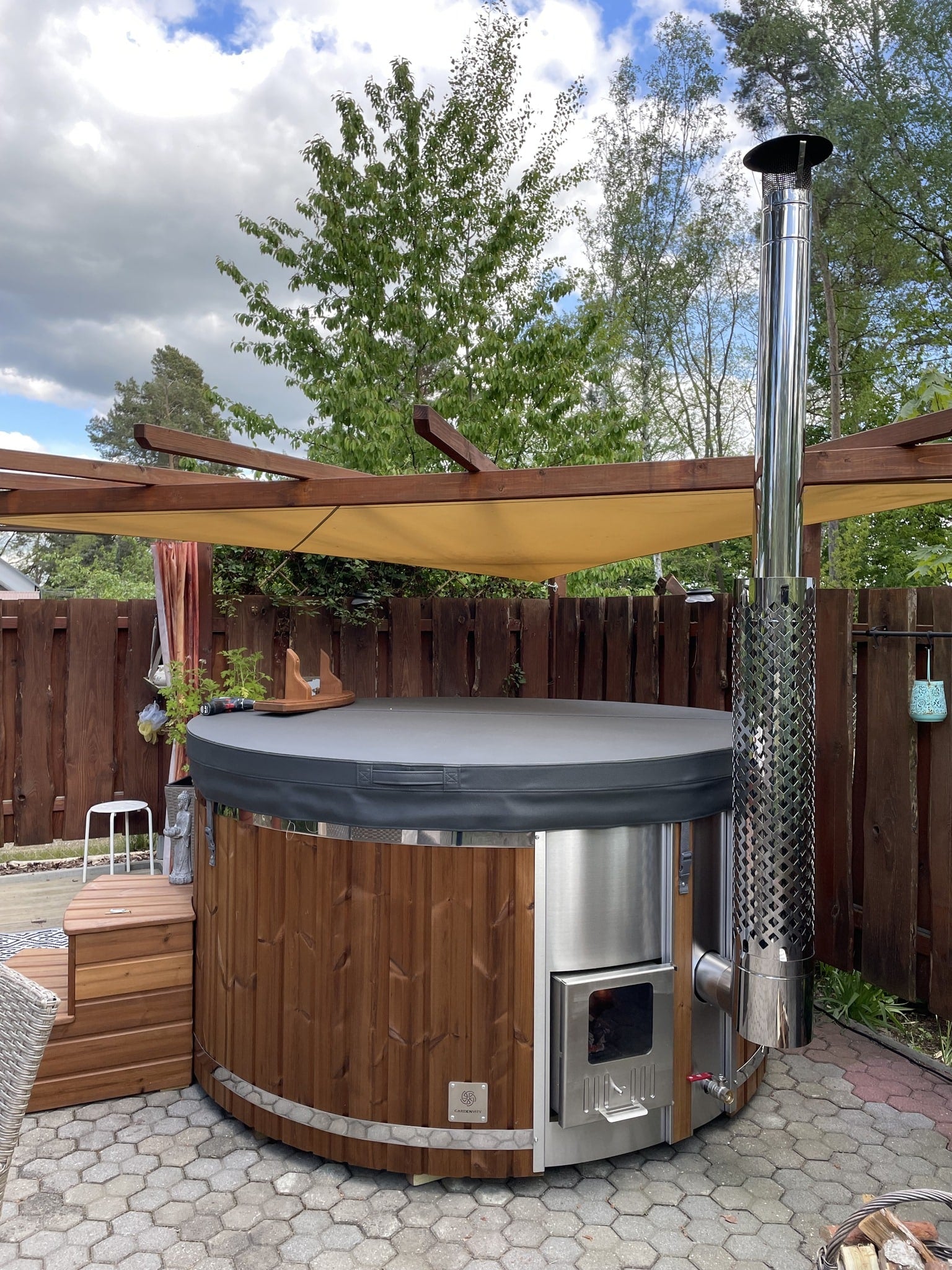 Gardenvity wood fired hot tub on tiled patio in German garden with wooden standard steps.