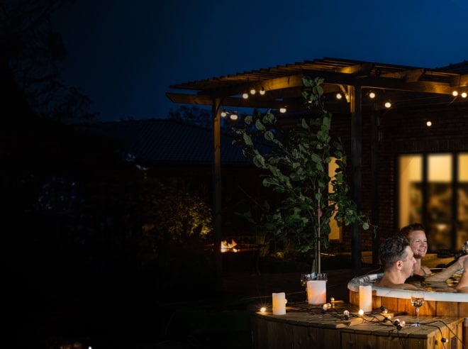 Couple relaxing in Gardenvity wood fired hot tub Ofuro at night with LED lighting and cozy atmosphere.