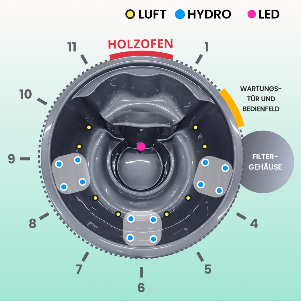 - Hydro-Massagesystem, 12 Düsen, 1,1 kW (680€)